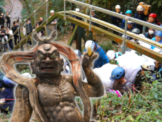 New 【清水区・霊山寺】「令和の大修復」終え千年前の仁王像帰還 200kg超の2体を人力で運び上げ