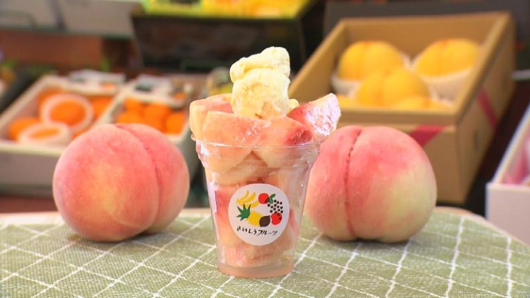 【三島・さいとうフルーツ】モモまる1個パフェ 川遊びしてそのまま買えるフルーツスタンド