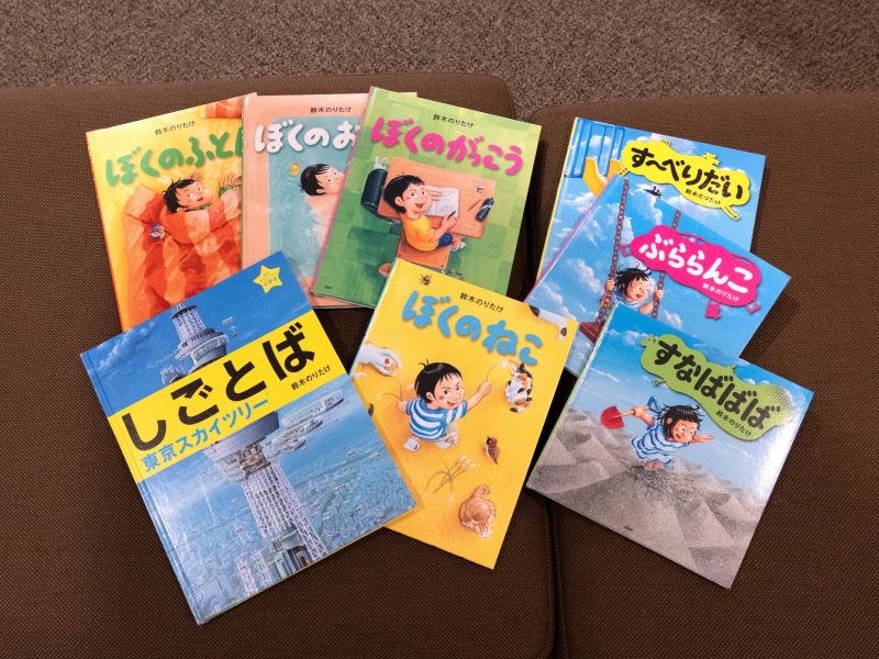 会場内の休憩スペースには鈴木のりたけさんの主な絵本が置かれており、自由に読むことができます。