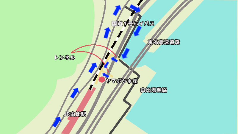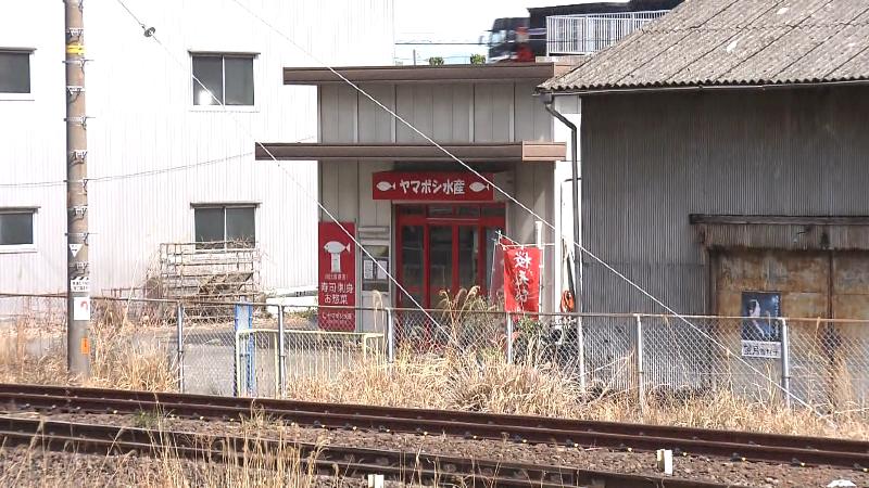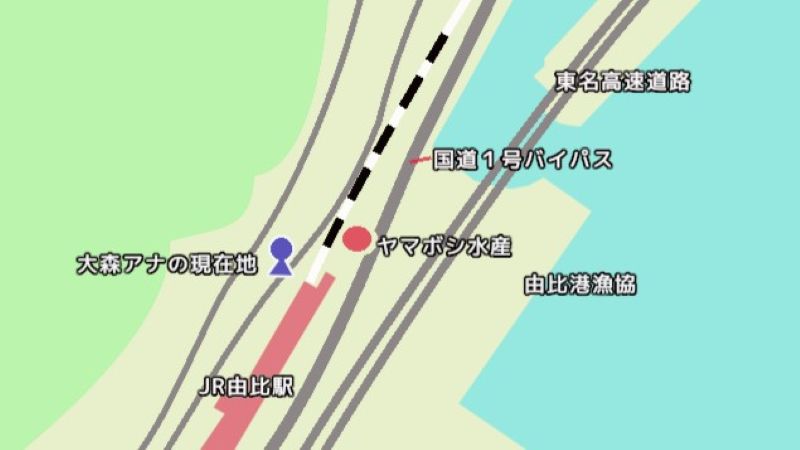 東海道線のJR由比駅から歩いてすぐの場所で探してみると、線路の向こう側に「ヤマボシ水産」という赤い看板をすぐ発見しました。