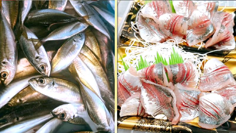 アジの水揚げと刺身