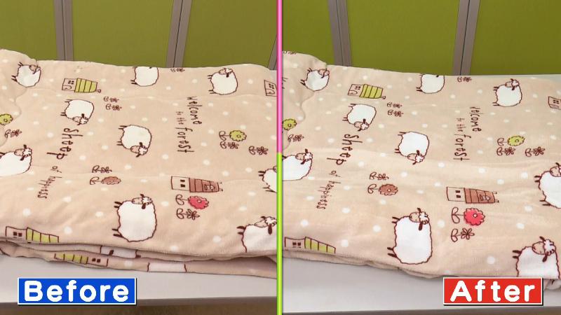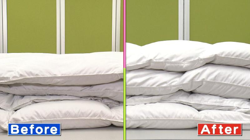 番組ディレクターのへたった羽毛布団は、ビフォーアフターで並べて比べると、この違い。プロの力でふかふかの布団に仕上がりました。