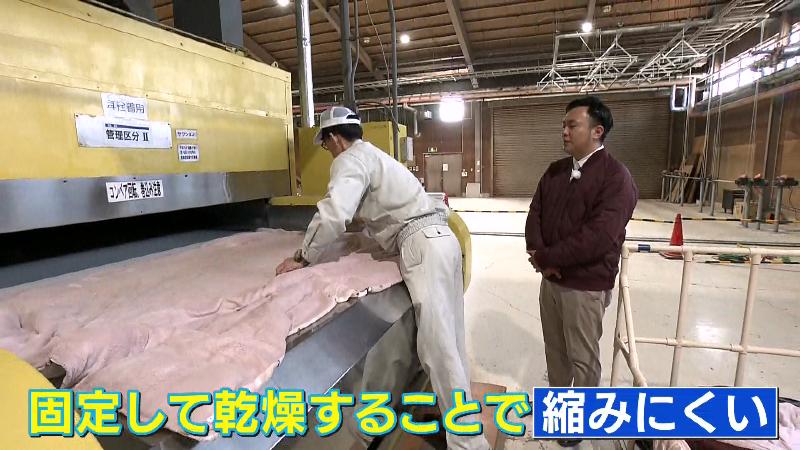 布団乾燥は初期段階で一番縮むんです。布団を固定して平面で流していくことで、縮みにくい状態で乾燥できます