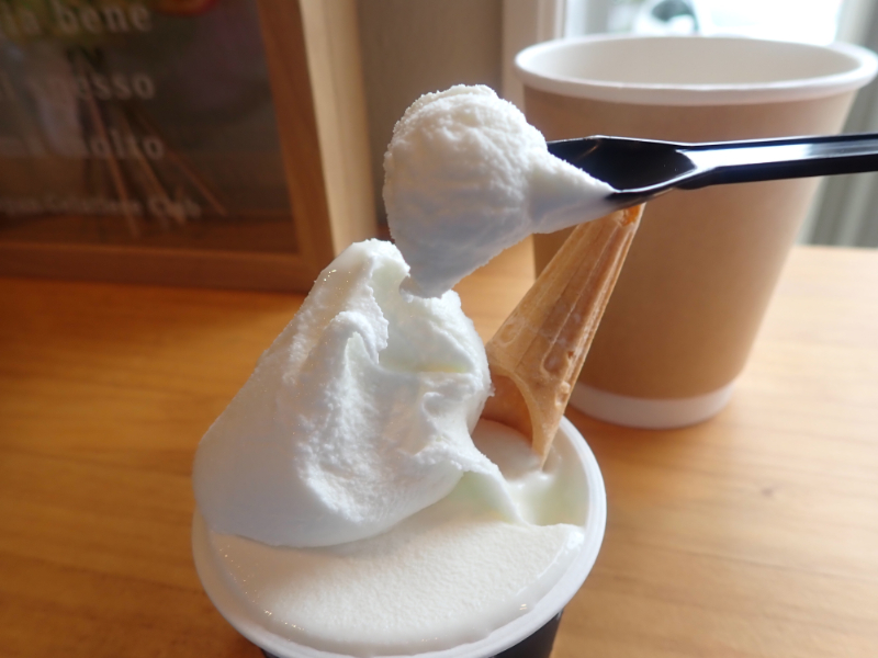 早速ひとつ注文してみましょう。「朝霧高原搾りたてミルクジェラート(カップ 540円)」です。カップを注文した際に必ず付いてくるミニコーンがかわいらしい。