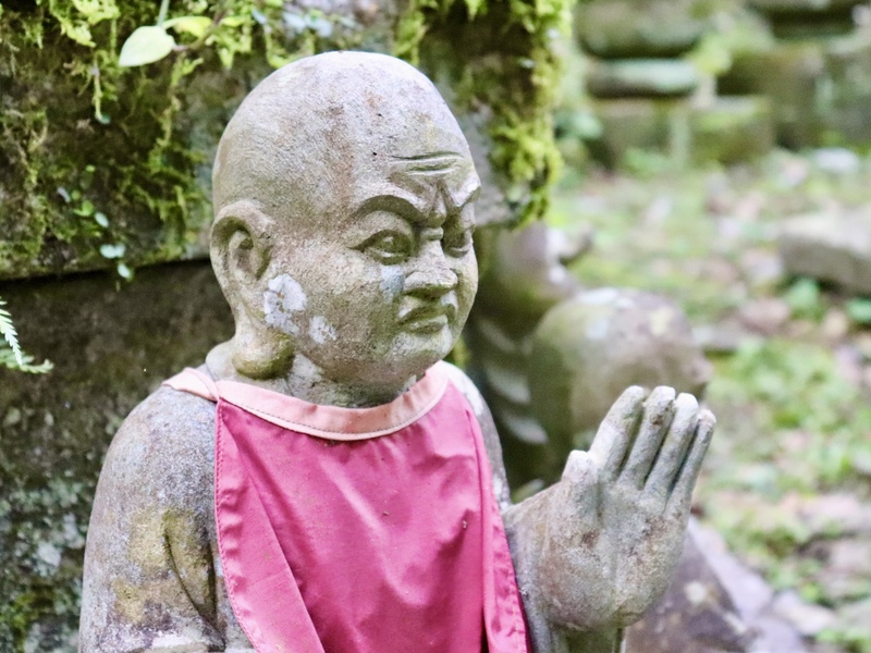 石像であることと、姿や大きさ故にお地蔵様と間違えられることもありますが、お地蔵様とは違って生きていた方々がモデルになっています。お釈迦様が入滅された後、500人の羅漢様が集まり、お釈迦様が生前おっしゃっていたことを確認し合い、それが経典の元となったと言われています。