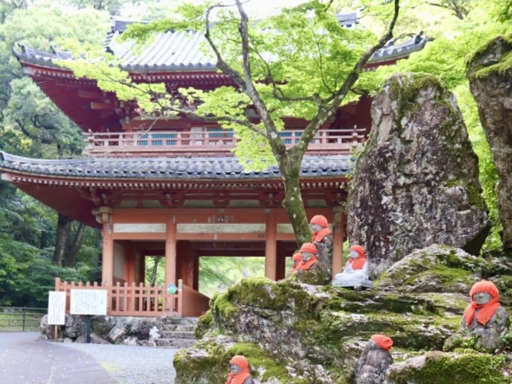 駐車場を抜けた先にあるのが山門、参道への入口です。本堂まで徒歩約15分の道のりで、入口から羅漢たちが出迎えてくれます。