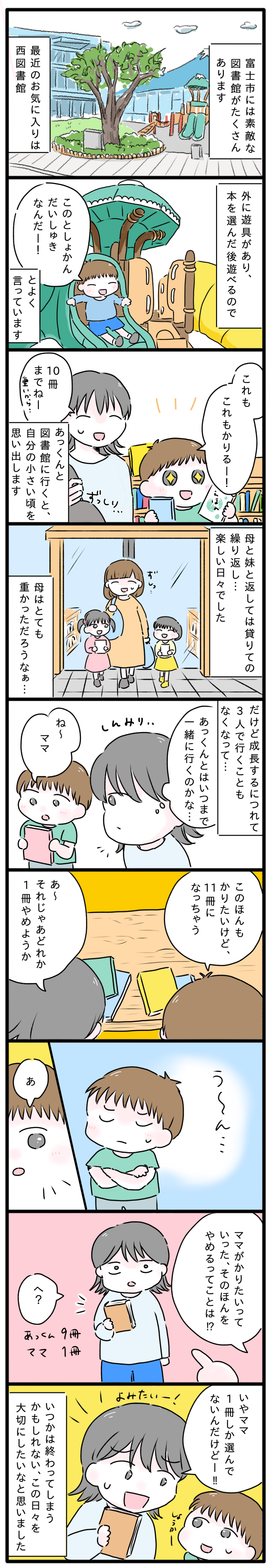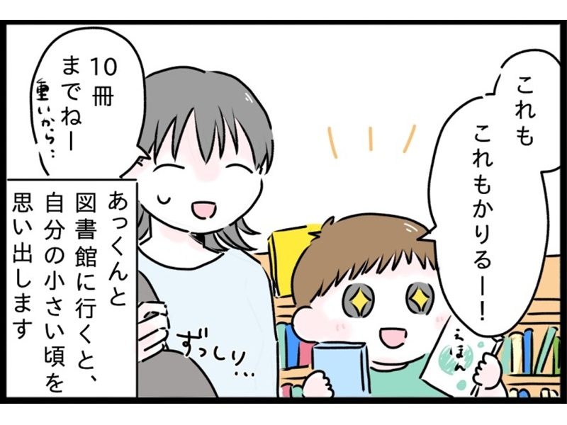 2025年5月20日 暮らす 【マンガ】 いき過ぎた4歳児の図書館“愛”〜元気ばくはつ!富士っ子あっくん#16〜 マンガ図書館子育て ここまる 元気ばくはつBOYのあっくんに振り回されながらも育児を楽しむ母・ここまる。そんな子育てのアレコレを富士山のお膝元、静岡・富士市よりお届けします。ご本ラブのあっくんとよく図書館に行くここまる。そんな中で自分の幼い頃の記憶がよみがえりました。 作/ここまる 【もっと見る! 元気ばくはつ!富士っ子あっくん】 【マンガ】4歳児がゾッコン「とり図鑑」! 〜元気ばくはつ!富士っ子あっくん#13〜 【マンガ】お疲れパパにも容赦ない4歳児 〜元気ばくはつ富士っ子あっくん#12〜