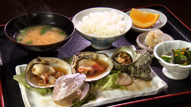 「貝焼き定食(1850円)」は、サザエなど数種類の貝が楽しめます。