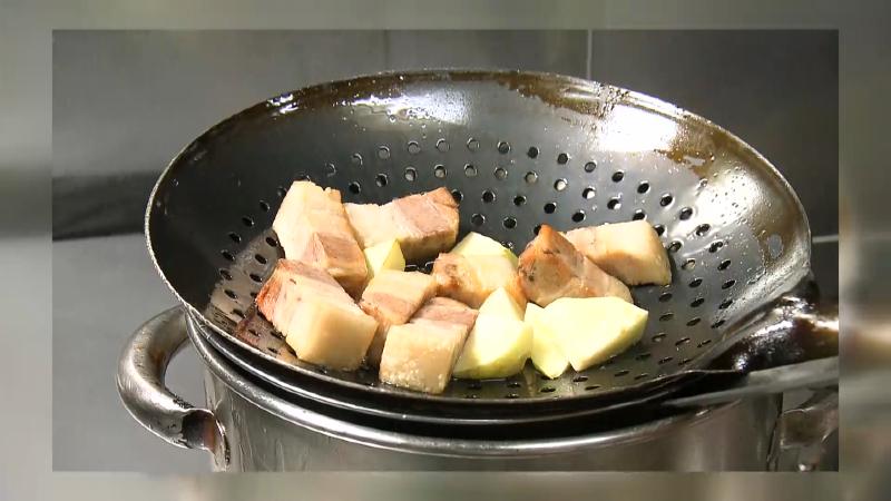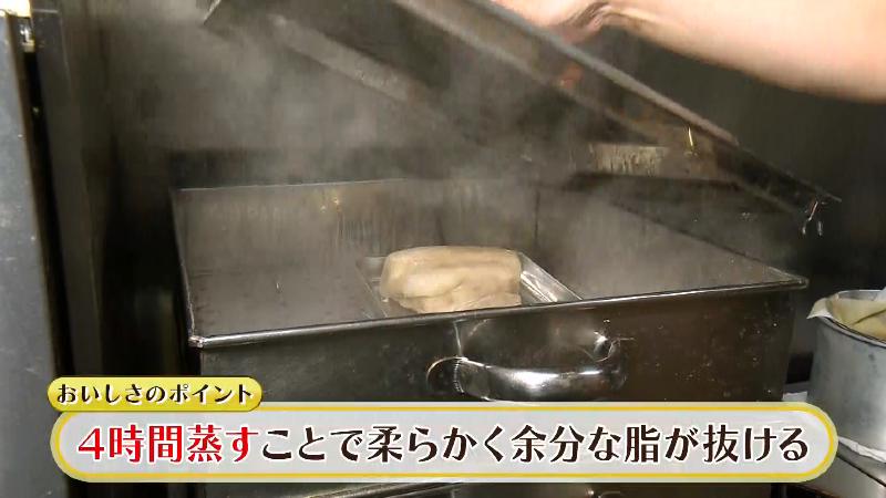 長時間蒸すことで柔らかくなり、余分な脂が抜けるんです。