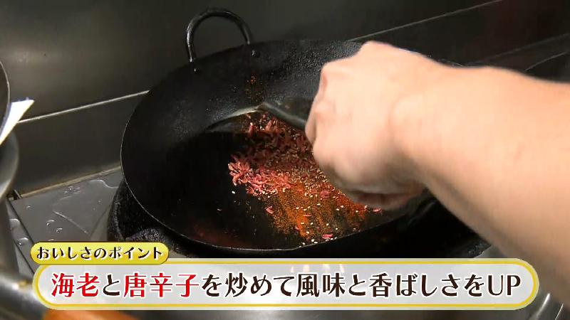 乾燥エビや唐辛子を先に軽く炒めて風味と香ばしさを出すのがポイントだそうです。