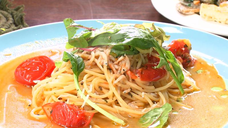 パスタの上には初夏の旬食材、地元掛川市大東産の桃太郎トマト。