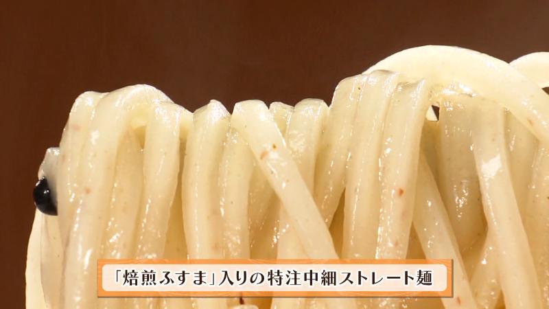 「焙煎ふすま」入りの特注中細ストレート麺を使用しています。