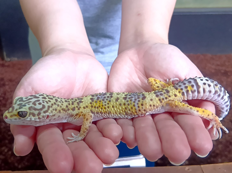 実際に、ヒョウモントカゲモドキを手の上に乗せてみました。