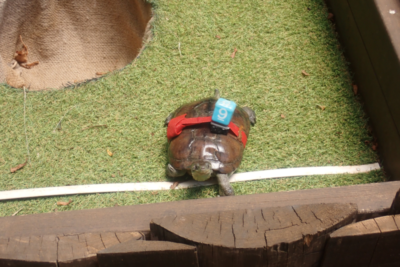 10匹のクサガメ・ミナミイシガメたちが、スタートからゴールまで障害物をよけながら頑張って走り切ります。