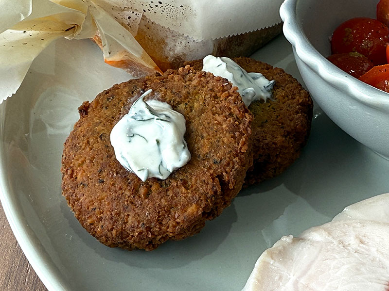 中東料理ファラフェルは、ひよこ豆のコロッケ。ザジキソースと呼ばれるヨーグルトソースには、ディルというハーブが入っています。