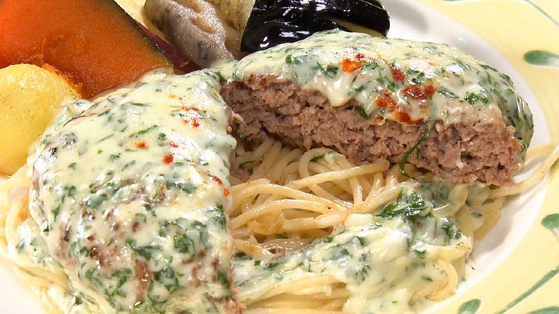 スパゲッティで「クリームしそ」というのをやっていたら、お昼にまかないで食べる時、ハンバーグを乗せたらおいしかったんです。それから商品にしました