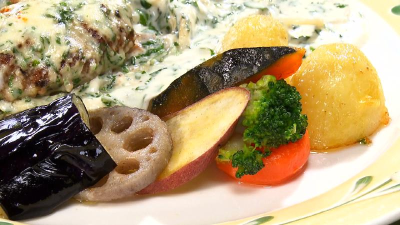 ふんわりジューシーなハンバーグと合わせるのは、まろやかなクリームソースと、爽やかに香るしそ。