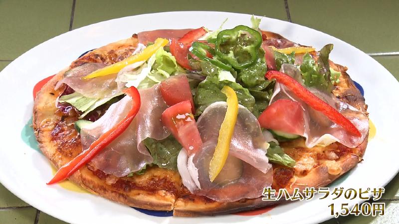「生ハムサラダのピザ(1540円)」は、新鮮な野菜と生ハムが、ピザ生地の上にこんもり盛られた一品です。