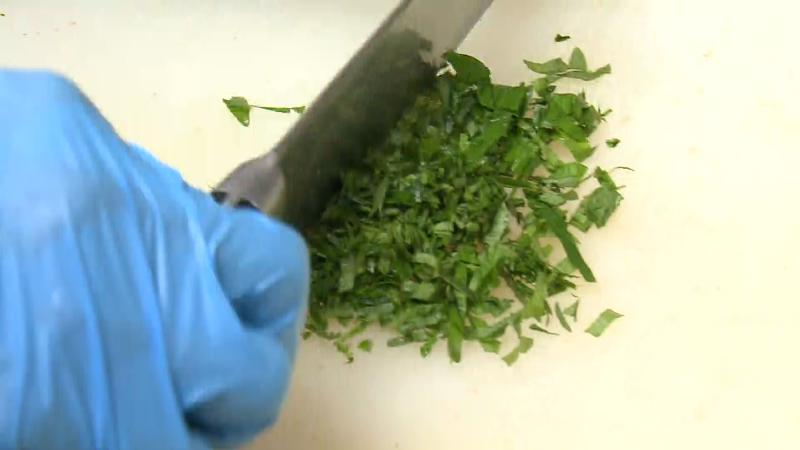 1束10枚のしその葉を細かく切って、ホワイトソースの中に入れているんです