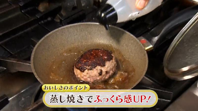 ハンバーグを焼く「蒸し焼きでふんわり感UP」