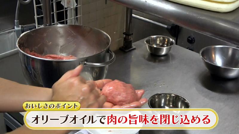 おいしさのポイントはオリーブオイルを使って焼く前にハンバーグをコーティングすること。