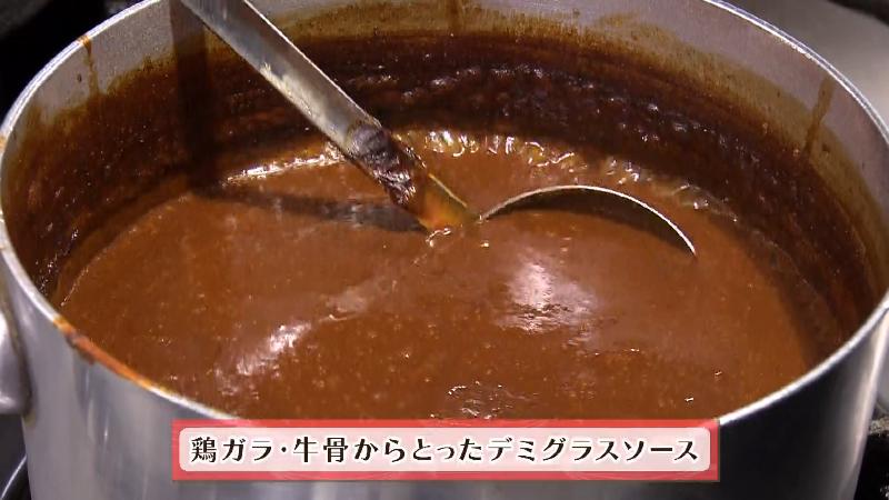 ソースは鶏ガラ、牛骨でだしをとってます。トマトや新タマネギ、そしてハンバーグの肉汁は全部水分が多いので、それに負けないように濃く仕上げています