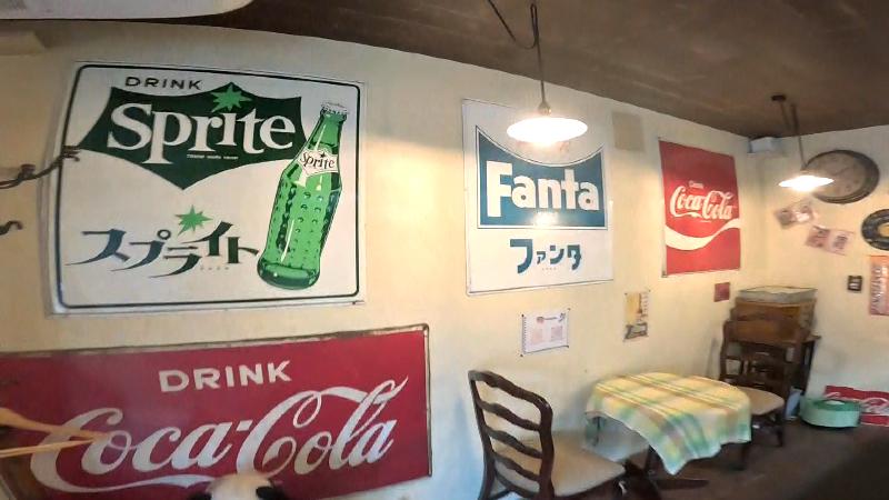 入ってすぐ左側の壁には、コカ・コーラ、スプライト、ファンタの大きな看板が飾られ、見る人を懐かしさへと誘います。
