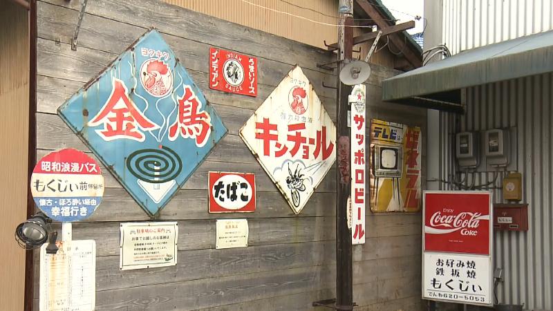 店外の壁一面に「キンチョール」や「サッポロビール」といったレトロ看板が並び、ノスタルジックな昭和の雰囲気を醸し出しています。