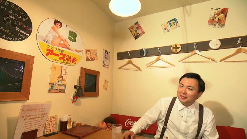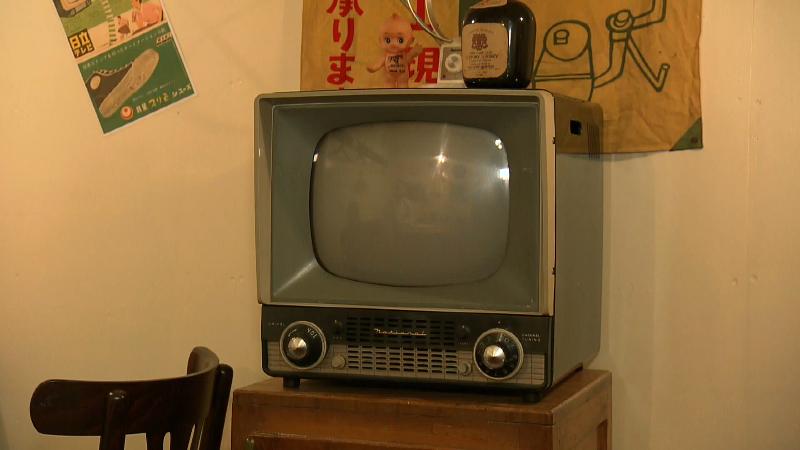 昔懐かしいチラシや看板などがちりばめられた空間には、ブラウン管テレビも鎮座していました。