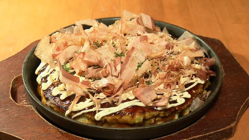 キャベツのみじん切りが入った生地には、あごだしと焼津産カツオ節が入り、うま味を一層引き立てます。