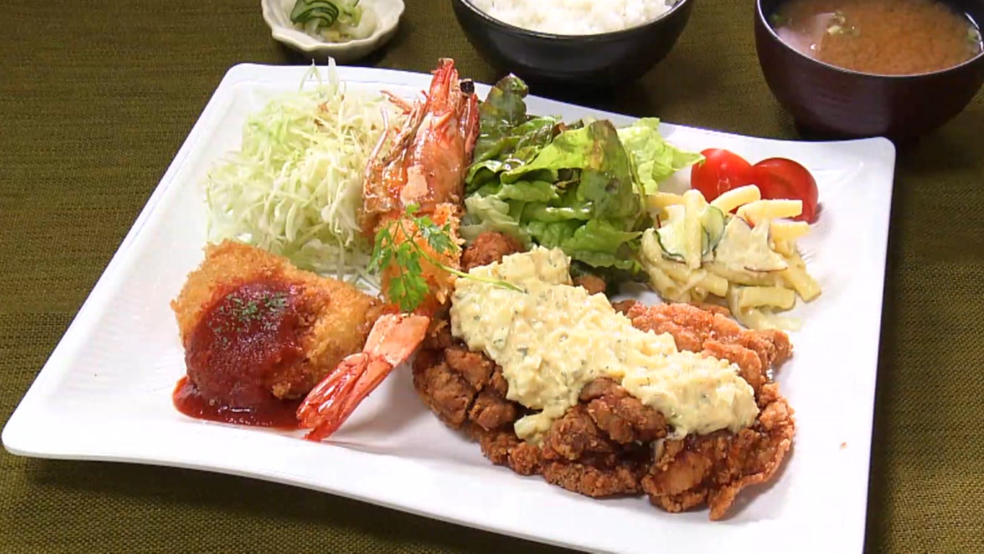 一皿で3種類の揚げ物が味わえる、なんともぜいたくな定食を家族みんなで楽しめば、特別なひとときになるのでは。