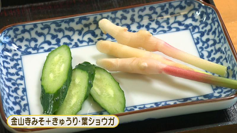 もう一つのオススメの食べ方は、金山寺みそ+キュウリ・葉ショウガ。