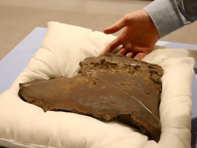大きさは横約3m、縦約1.3m、重さは約4.5tです。市街地に飛び散った破片の一つが今回「触れられる展示品」として展示されています。