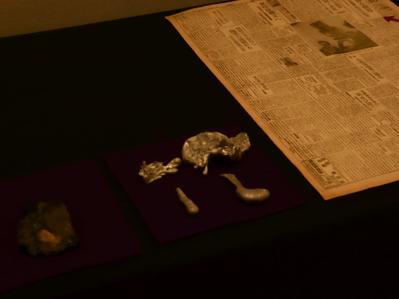 溶けたアルミ釜の一部は、男性が台所があった場所から掘り出した妻の遺骨と共にでてきました。変形や変色した展示品が、被害の大きさを物語っています。