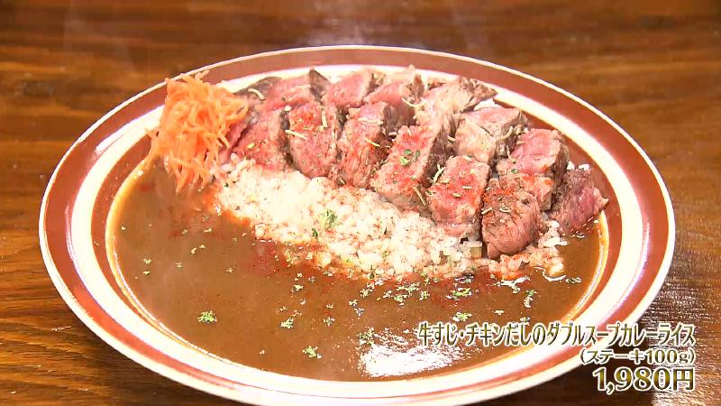 「牛すじ・チキンだしのダブルスープカレーライス(ステーキ100g・1980円)」は、肉好きにもカレー好きにもたまらない一品です。