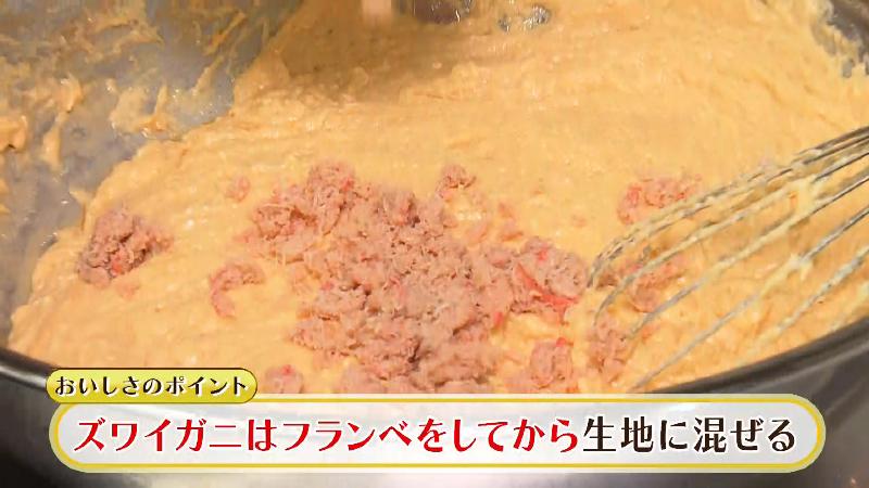 オマールエビのだしは、中身を作る時に混ぜ込んでいるので、全体がオレンジ色でだしが効いています。ズワイガニは、フランベをしてから生地に混ぜ込み、全体からカニの味がするように仕上げています