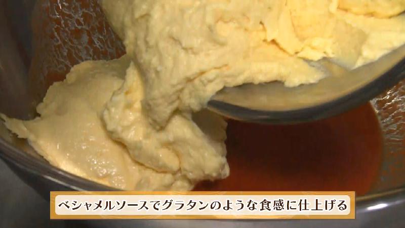 これはアパレイユと呼ばれるものですが、通常キッシュを作るときに使う卵液ではなく、ベシャメルソースを使用することで、グラタンのような柔らかい食感・味わいに仕上げています。
