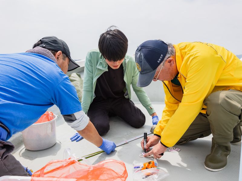 ダイバーからアマモを受け取った笹浪教授は長さを計測し、採取地点を記したタグを付けていきます。