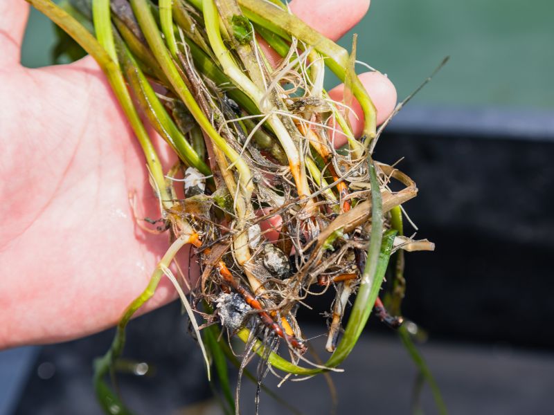 アマモは全国的に減少しています。その原因としては、温暖化や水中の栄養分の変化など考えられますが、はっきりとしたことはわかっていません。ただ浜名湖の場合は、2018年の台風24号でアマモが根こそぎ流されてしまったことが、急激な減少の一因ではないかと考えています