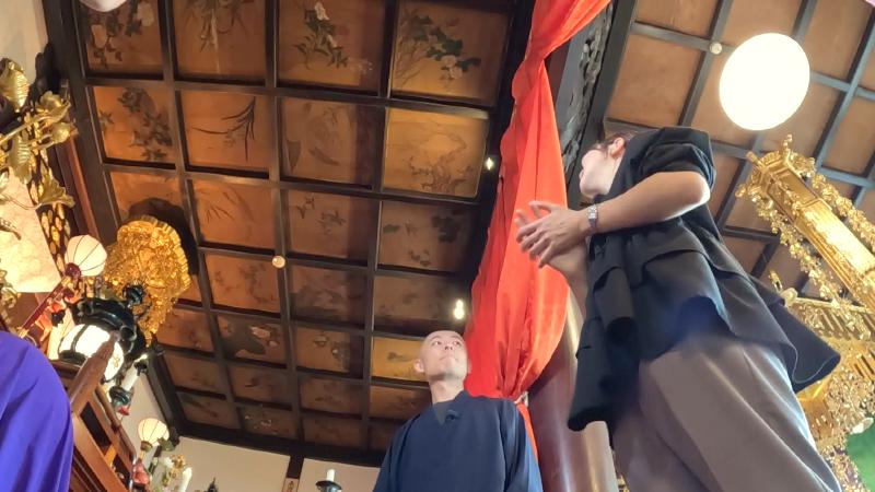 石田副住職が指す方向を見上げると、花や鳥が描かれた天井画が一面にありました。