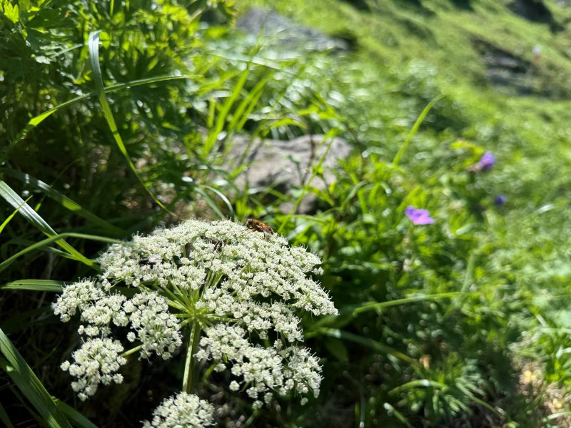 だんだんと木の背丈が低くなり、足元にお花が姿を現し始めます。そして、風にのって人の笑い声が遠くから聞こえてきました。山小屋が近いに違いありません。