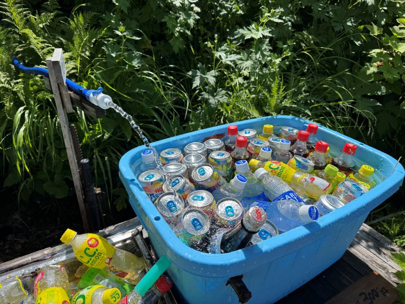 周囲にはシナノキンバイやシシウドが咲き、小屋の隣ではこの日ヘリで空輸されたばかりの飲み物が、豊富な湧き水にひたされて、キンキンに冷えていました。