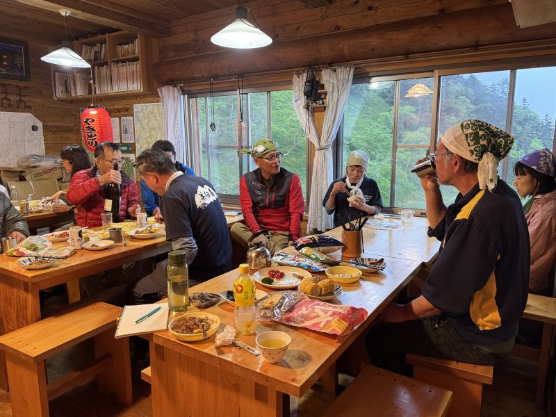 名倉さんを慕う人たちが集まる「茶臼山の会」があり、この日は小屋開けの手伝いに十数名が泊まっていました。
