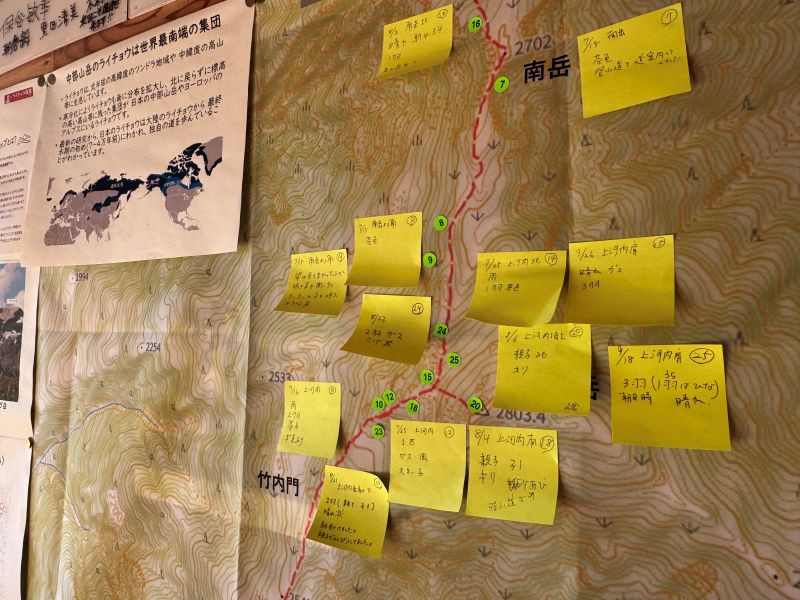 ちなみに茶臼小屋にはライチョウの目撃マップがあります。「見かけた」と小屋のスタッフに伝えると、地図に表示できるほか、記念のシールがもらえます。