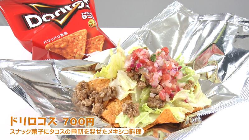 ドリロコスはドリトスというお菓子を使っています。この中にスパイスで味付けしたひき肉やレタスなどの野菜を混ぜたメキシコ料理です