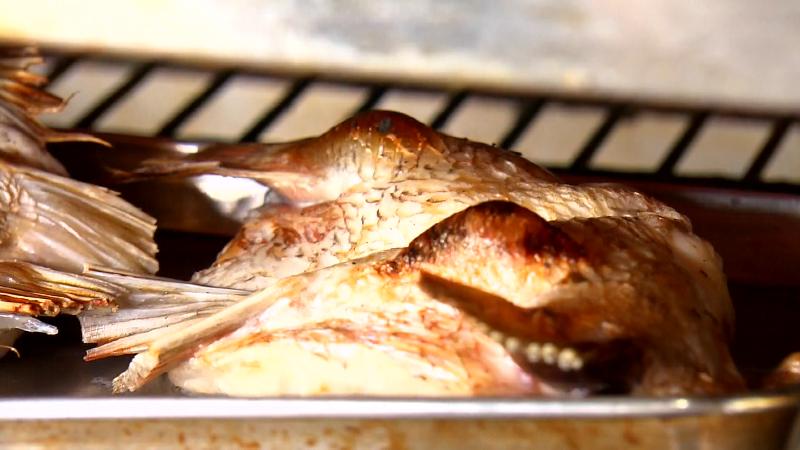駿河湾の西浦エリアで養殖されたマダイのアラを使ってスープを作っています。仕入れたマダイをその日のうちに焼いてだしをとっています。焼くことで臭みが取れ、アラには身が結構ついていますので、骨だけでなく身からもうま味が出るんです
