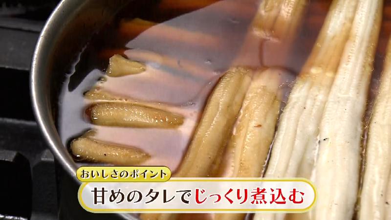 今が旬のアナゴは、しょうゆやみりんをベースにした甘めの特製ダレでじっくり煮込むのがおいしさのポイント。