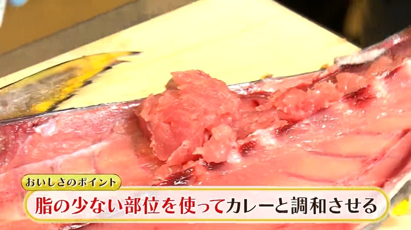 肉の代わりにマグロを使ったカレーです。本マグロのすき身の部分やしっぽの部分など、脂が少なくて身がしっかりした部分を使っています。カレー自体も脂っぽくならないようにしています