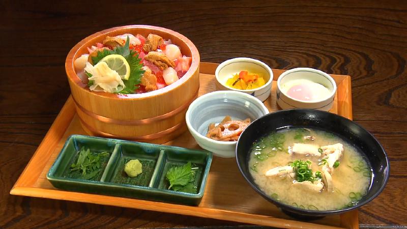 自慢のメニューは大きなおひつに入った「特選海鮮ひつまぶし(2618円)」。みそ汁と小鉢が付いています。