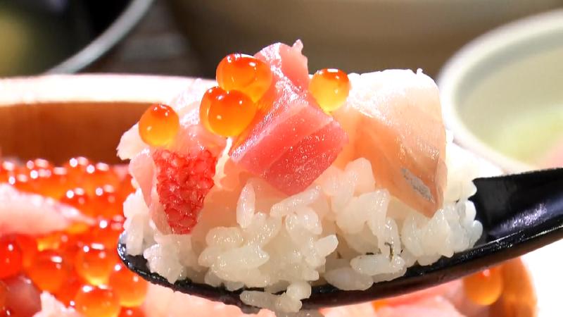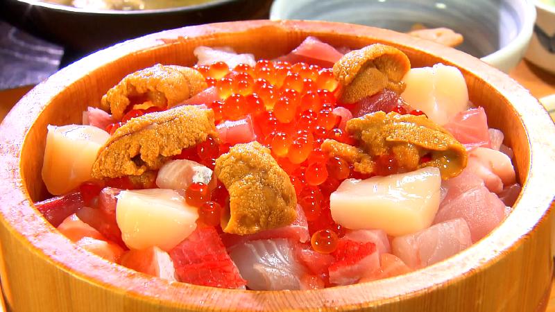 静岡・沼津港のグルメを調査。魚料理が自慢の食堂「沼津かねはち」には、こぼれるほどの魚介がのった豪華海鮮ひつまぶしがありました。ワサビしょうゆ、温泉卵、だし茶漬けの3通りで食べちゃって!